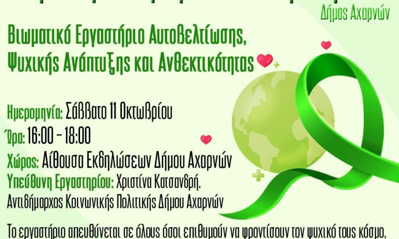 Με αφορμή την Παγκόσμια Ημέρα Ψυχικής Υγείας, ο Δήμος Αχαρνών διοργανώνει ένα βιωματικό εργαστήριο Αυτοβελτίωσης, Ψυχικής Ανάπτυξης και Ανθεκτικότητας, αφιερωμένο στην ενδυνάμωση, την εσωτερική ισορροπία και τη θετική στάση ζωής. Μέσα από δημιουργικές τεχνικές της θετικής ψυχολογίας, της χοροθεραπείας, της δραματοθεραπείας και της παιγνιοδράσης, οι συμμετέχοντες θα έχουν την ευκαιρία να: