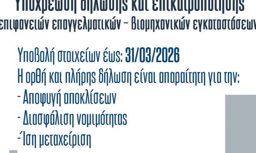 Ο Δήμος Αχαρνών ενημερώνει τις επιχειρήσεις και τις βιομηχανικές εγκαταστάσεις που δραστηριοποιούνται εντός των διοικητικών του ορίων και ιδίως εντός της βιομηχανικής ζώνης, ότι στο πλαίσιο ελέγχου και επικαιροποίησης των στοιχείων που τηρούνται στις υπηρεσίες του Δήμου, καλούνται να προβούν σε δήλωση των πραγματικών τετραγωνικών μέτρων των εγκαταστάσεών τους.