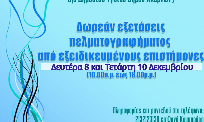 Δωρεάν εξετάσεις πελματογραφήματος στις 8 και στις 10 Δεκεμβρίου διοργανώνει, για πολλοστή φορά, το Τμήμα Προστασίας και Προαγωγής της Δημόσιας Υγείας της Διεύθυνσης Κοινωνικής Πολιτικής του Δήμου Αχαρνών σε συνεργασία με την εταιρεία Pelma Analysis.