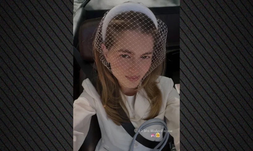 Σε μία από αυτές η ίδια φορά ένα νυφικό βέλο, ενώ η φωτογραφία συνοδευόταν από τη λεζάντα “Its Mrs Medwell to you (Κυρία Μέντγουελ για εσάς)”.
