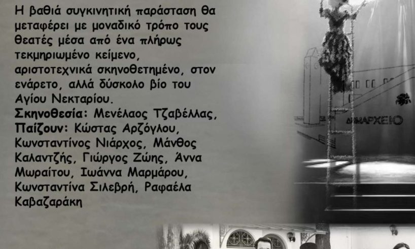 Τρίτη μέρα σήμερα για τις Βραδιές Πολιτισμού με την παράσταση «Άγιος Νεκτάριος από τη γη στον ουρανό».Μια βαθιά συγκινητική παράσταση που αφηγείται τη ζωή του Αγίου Νεκταρίου από την πνευματική του προσφορά και το φιλανθρωπικό του έργο έως τις διώξεις που υπέστη και την τελική αγιοποίησή του.Η παράσταση συνδυάζει αποκαλυπτική αφήγηση με έντονα δραματικές σκηνές, μεταφέροντας τους θεατές, μέσα από ένα πλήρως τεκμηριωμένο και αριστοτεχνικά σκηνοθετημένο κείμενο, στον ενάρετο αλλά δύσκολο βίο του Αγίου Νεκταρίου. Στόχος είναι να υπενθυμίσει ότι, παρά τις αντιξοότητες της ζωής, ο δρόμος της αρετής και της ανθρωπιάς παραμένει πάντοτε φωτισμένος με δύναμη και ελπίδα.