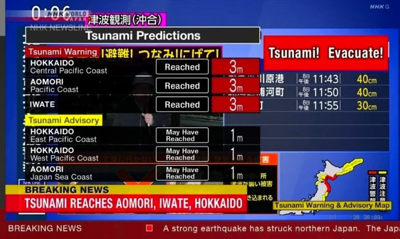 Τσουνάμι ύψους περίπου 40 εκατοστών παρατηρήθηκε στα λιμάνια Μούτσου Ογκάουαρα του Αομόρι και Ουρακάουα του Χοκάιντο πριν από τα μεσάνυχτα, σύμφωνα με την JMA, μετά τον τρομακτικό σεισμό 7,6 Ρίχτερ που σημειώθηκε στην Ιαπωνία.