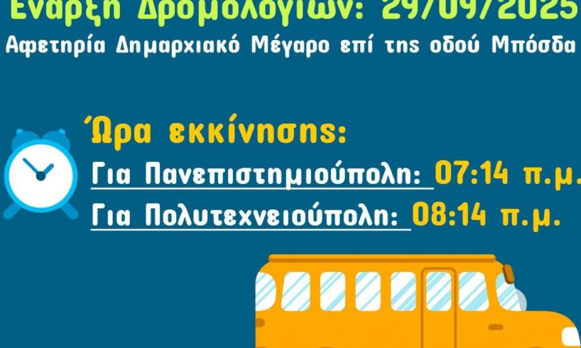 Στο πλαίσιο της δράσης «Κάθε μέρα στη σχολή με το Δήμο Αχαρνών», παρέχεται και φέτος δωρεάν μετακίνηση προς τα Πανεπιστημιακά Ιδρύματα. Από τις 29 Σεπτεμβρίου 2025, οι φοιτητές και οι φοιτήτριες της πόλης μας θα μπορούν να μεταβούν με λεωφορείο του Δήμου Αχαρνών στις σχολές του Εθνικού και Καποδιστριακού Πανεπιστημίου Αθηνών (ΕΚΠΑ) όπως και στις σχολές του Εθνικού Μετσόβιου Πολυτεχνείου (Πολυτεχνειούπολη και Πανεπιστημιούπολη Ζωγράφου). Τη στήριξη του Δήμου Αχαρνών στους φοιτητές της πόλης μας και τις ευχές τους για καλές σπουδές και πολλές επιτυχίες σε κάθε τομέα της ζωής τους εξέφρασε ο Δήμαρχος Αχαρνών Σπύρος Βρεττός.