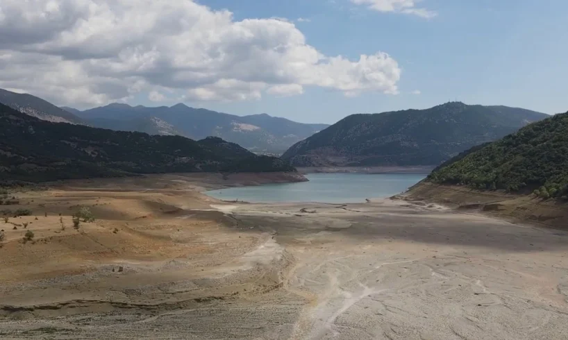 Η δραματική υποχώρηση της στάθμης αποκαλύπτει ένα απόκοσμο τοπίο, με το βυθισμένο χωριό Κάλλιο -όπως φαίνεται και στα πλάνα του drone του Orange Press Agency, από τις 15 Σεπτεμβρίου του 2025- να έχει αναδυθεί, θυμίζοντας εικόνες από την περίοδο της μεγάλης ξηρασίας στις αρχές της δεκαετίας του ’90.