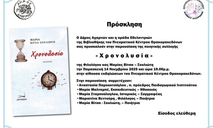 Ο Δήμος Αχαρνών και η ομάδα Εθελοντριών της Βιβλιοθήκης του Πνευματικού Κέντρου Θρακομακεδόνων σας προσκαλούν στην παρουσίαση της ποιητικής συλλογής «Χρονολυσία» της Φιλολόγου κας Μαρίας Βίτσα – Σουλιώτη την Παρασκευή 14 Νοεμβρίου 2025 και ώρα 19.00 μ.μ. στην αίθουσα εκδηλώσεων του Πνευματικού Κέντρου Θρακομακεδόνων.