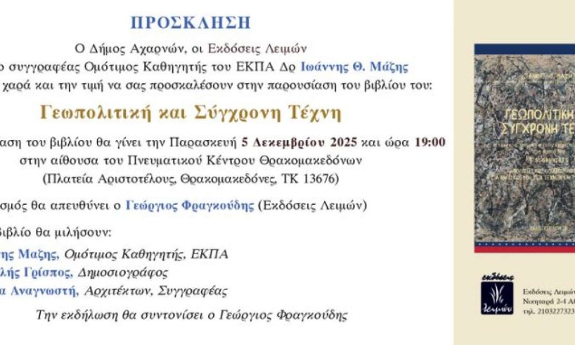 Ο Δήμος Αχαρνών, οι Εκδόσεις Λειμών και ο συγγραφέας – Ομότιμος Καθηγητής του ΕΚΠΑ Δρ. Ιωάννης Θ. Μάζης προσκαλούν το κοινό στην παρουσίαση του νέου του βιβλίου με τίτλο: «Γεωπολιτική και Σύγχρονη Τέχνη» την Παρασκευή 5 Δεκεμβρίου 2025, στις 19:00, στο Πνευματικό Κέντρο Θρακομακεδόνων, Πλατεία Αριστοτέλους, Θρακομακεδόνες (ΤΚ 13676)