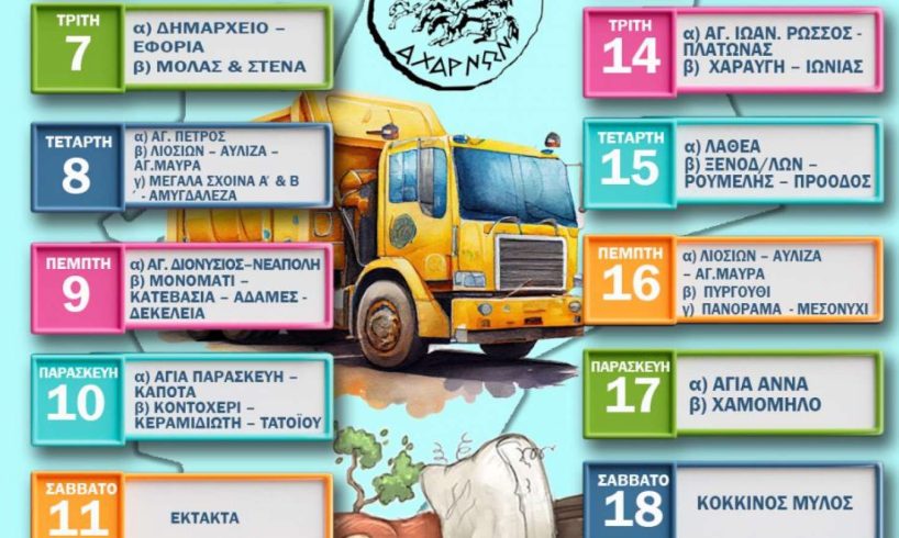 Η Διεύθυνση Καθαριότητας και Ανακύκλωσης του Δήμου Αχαρνών ανακοινώνει το πρόγραμμα αποκομιδής ογκωδών αντικειμένων από τις 6 έως τις 19 Οκτωβρίου. Το πρόγραμμα δημοσιοποιείται με σκοπό τη διευκόλυνση του συντονισμού μεταξύ των δημοτών και της υπηρεσίας, ώστε να αποφεύγεται η παραμονή ογκωδών αντικειμένων στους δρόμους για μεγάλο χρονικό διάστημα.