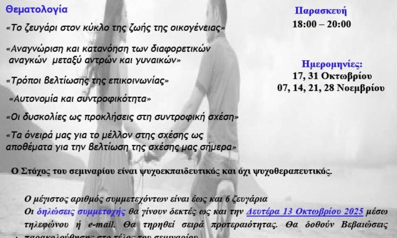 Με θεματολογία που αφορά κάθε σύγχρονο ζευγάρι το σεμινάριο έχει ψυχοεκπαιδευτικό στόχο. οι ενδιαφερόμενοι μπορούν να υποβάλλουν δήλωση συμμετοχής είτε ηλεκτρονικά είτε τηλεφωνικά επικοινωνώντας με τη Διέξοδο.