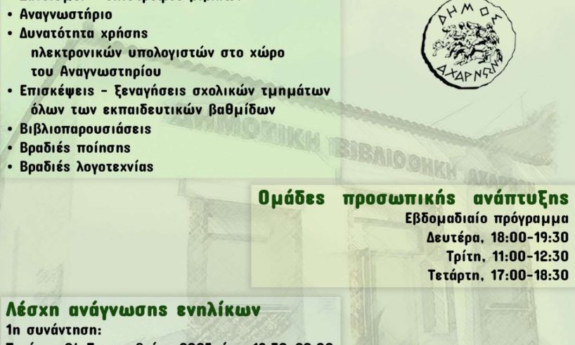 Η Δημοτική Βιβλιοθήκη Αχαρνών ανακοινώνει το νέο πρόγραμμα δραστηριοτήτων για τη σεζόν Σεπτέμβριος 2025 – Μάιος 2026, προσκαλώντας όλους τους δημότες σε ένα πλούσιο πρόγραμμα πολιτισμού, μάθησης και προσωπικής ανάπτυξης προσεχτικά σχεδιασμένο από το προσωπικό της βιβλιοθήκης και με την επίβλεψη του Αντιδημάρχου Παιδείας και Προσχολικής Αγωγής Νικόλαου Δαμάσκου.