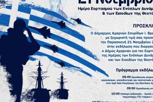 Ο Δήμος Αχαρνών τιμά την Ημέρα Εορτασμού των Ενόπλων Δυνάμεων & των Εισοδίων της Θεοτόκου, την Παρασκευή 21 Νοεμβρίου. Πρόγραμμα εκδήλωσης 09:45 Προσέλευση εκπροσώπων, οργανώσεων, εκπαιδευτικών και πολιτιστικών φορέων στον Ιερό Ναό... Read more »