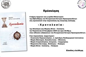 Ο Δήμος Αχαρνών και η ομάδα Εθελοντριών της Βιβλιοθήκης του Πνευματικού Κέντρου Θρακομακεδόνων σας προσκαλούν στην παρουσίαση της ποιητικής συλλογής «Χρονολυσία» της Φιλολόγου κας Μαρίας Βίτσα – Σουλιώτη την Παρασκευή 14 Νοεμβρίου 2025 και... Read more »